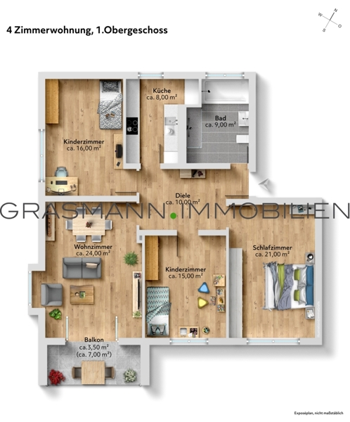 Beschreibung der ImmobilieDie im 1. Obergeschossen gelegene, helle, großzügige 4 Zimmerwohnung verfügt über eine einladende Diele, von der aus es in das geräumiges ca 9 m² großes Tageslicht Wannenbad mit Walk-in Dusche geht, in die ca. 8 m² große Küche, inklusive Einbauküche, in das ca. 24 m² große Wohn-/Esszimmer mit Zugang zur Loggia, in das ca. 21 m² große Schlafzimmer und in die beiden ca. 15 bzw. 16 m² großen Kinderzimmer.